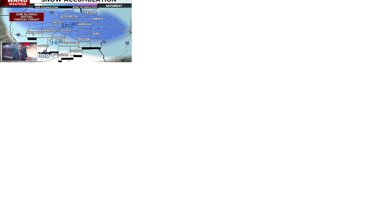 12+ hour, 10+ min ago (151+ words) DECATUR, Ill. (WAND) -Another blast of accumulating snow for central Illinois on Saturday. Much like its predecessor, this event will be a fast-moving storm that will wind down later Saturday afternoon from west to east. Before it does, accumulations will peak near an inch per hour! The main difference between this storm and Thursday night's feature is the snow composition. Saturday's storm will be a lot lighter and fluffier, powdery, if you will. It's easy to shovel, but for some of us, it may take a couple outings. The reason: blowing and drifting. The wind won't be terribly strong Saturday afternoon and night, but even 10-15 mph will be enough to blow the powdery snow around. If the snow wasn't enough, air that originated over Siberia will drop in Saturday night and Sunday. Feels like temperatures will become dangerously low, bottoming out…...
